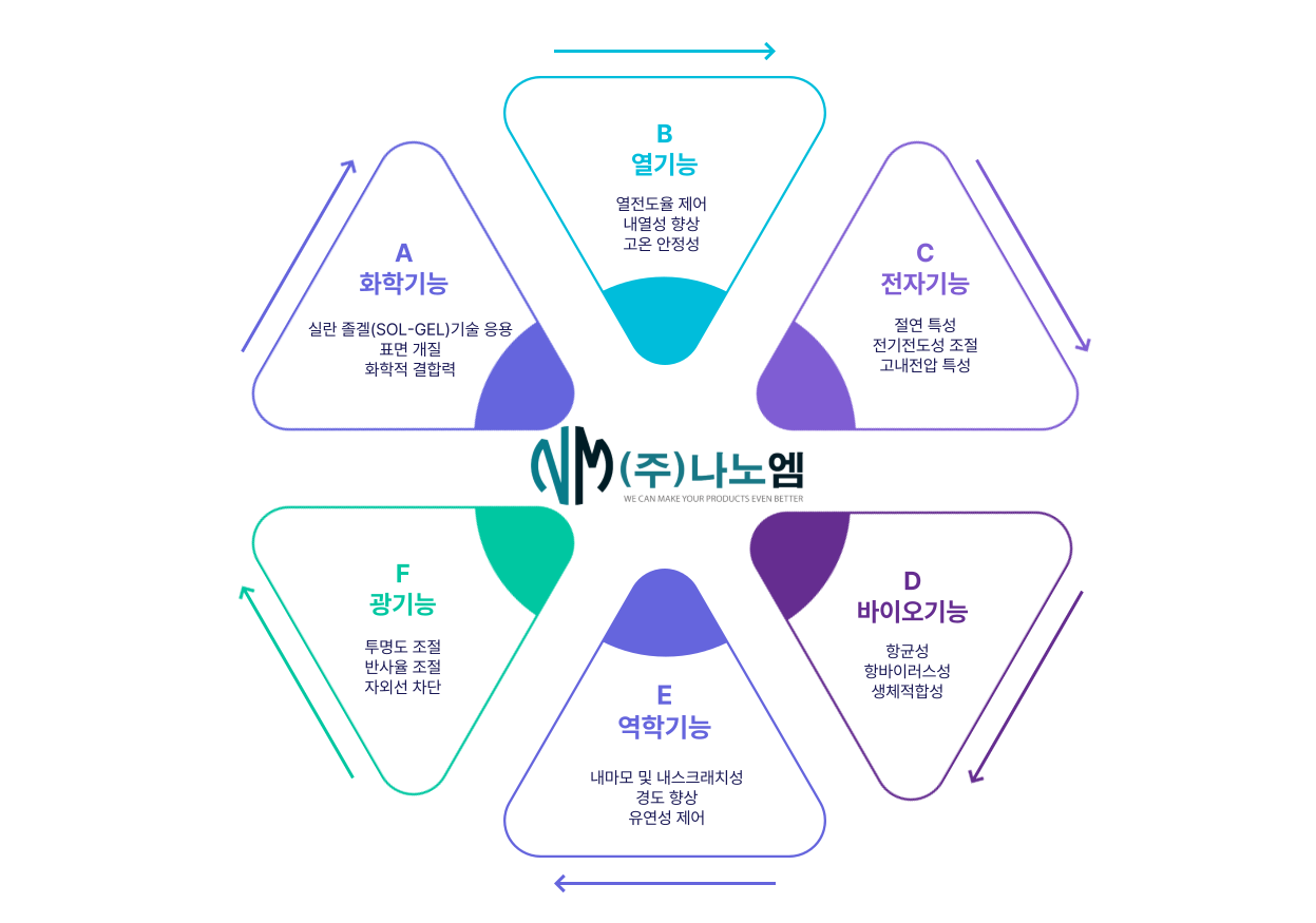 나노엠은 기능성 무기졸겔(SOL-GEL)코팅 분야에서 국내·외 MLCC 제조 함침액, 면상발열체용 내열·절연 코팅액, 대전방지 코팅액을 비롯한 다양한 기능성 무기졸겔 코팅액을 개발 및 제조하고 있습니다.