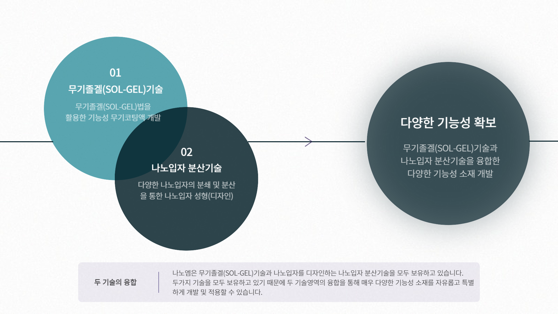 두 가지 사업영역은 상호 간의 융· 복합을 통해 시너지 효과를 발휘하며, 이를 통해 새롭고 다양한 기능성 소재의 신규 개발 및 사업 영역의 확장에 노력을 다하고 있습니다.
