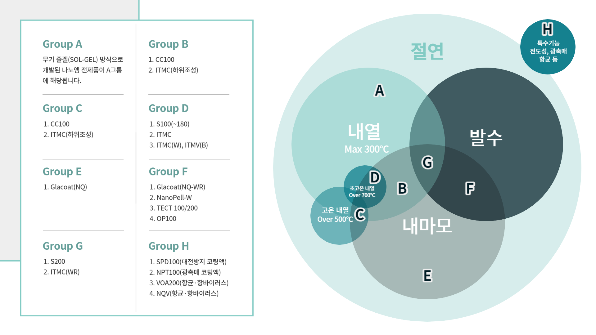 (주)나노엠 : 기능성 코팅액(주)나노엠은 졸겔(SOL-GEL)방식으로 코팅액을 개발, 제조하고 있습니다. 나노엠 무기졸겔(SOL) 기능성 코팅액을 주요 특성치별로 그룹(Group)화하여 표기하면 아래의 그래픽 이미지와 같이 정리가 가능합니다. 위의 버튼을 클릭하여 해당 제품의 상세 설명페이지로 이동이 가능합니다.
